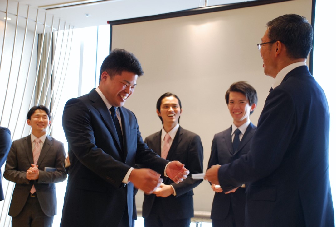 新入社員のスピーチでは入社の決め手となったエピソードやこれからの抱負、将来の目標などを発表しました。スピーチ後には、社長からの名刺授与があり、社会人として新たなスタートを切りました。